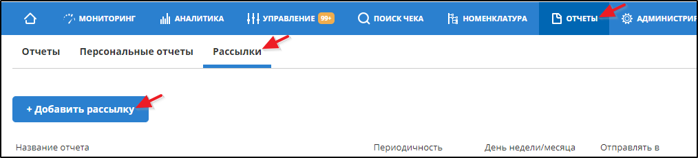 Перейти в раздел "ОТЧЕТЫ" - "Рассылки" и нажать кнопку "+ Добавить рассылку":