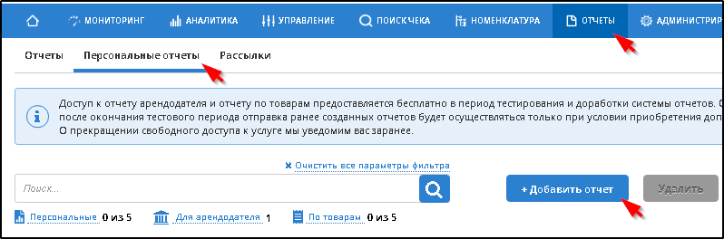 Для заказа отчёта необходимо перейти в раздел "ОТЧЕТЫ", нажать кнопки "Персональные отчеты" и "+ Добавить отчет":