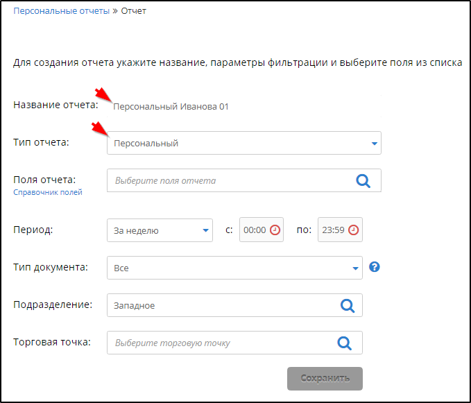 Придумать и указать название отчёта, затем выбрать тип отчёта "Персональный". Пример: