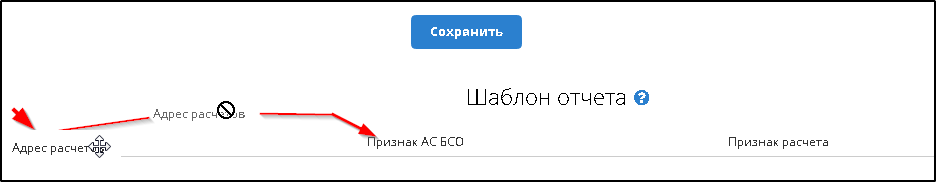 Изменить порядок столбцов в отчете можно, перетащив название столбца в шаблоне отчёта на место названия другого столбца. Столбцы поменяются местами и в сформированном XLS-файле будут упорядочены соответственно. Пример обмена местами столбцов "Адрес расчётов" и "Признак АС БСО":