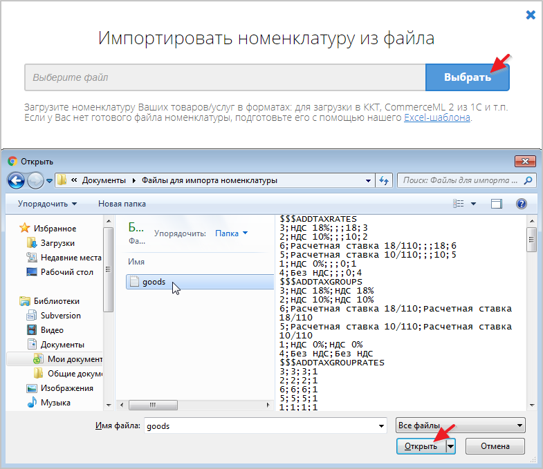 Нажать кнопку "Выбрать" и выбрать файл со сведениями о товарных позициях. В случае отсутствия готового файла загрузите Excel-шаблон и заполните его.