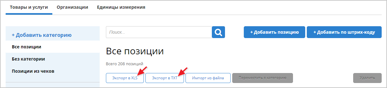 На вкладке "Товары и услуги" нажать кнопку "Экспорт в XLS" или "Экспорт в TXT" в зависимости от требуемого формата готового файла: