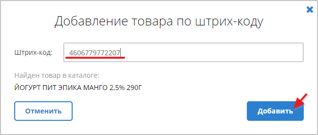 Нажать кнопку "+ Добавить по штрих-коду":