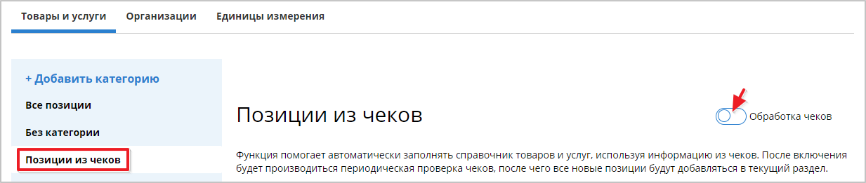 Для включения функции необходимо на вкладке "Товары и услуги" выбрать в списке слева пункт "Позиции из чеков" и нажать на переключатель "Обработка чеков".
