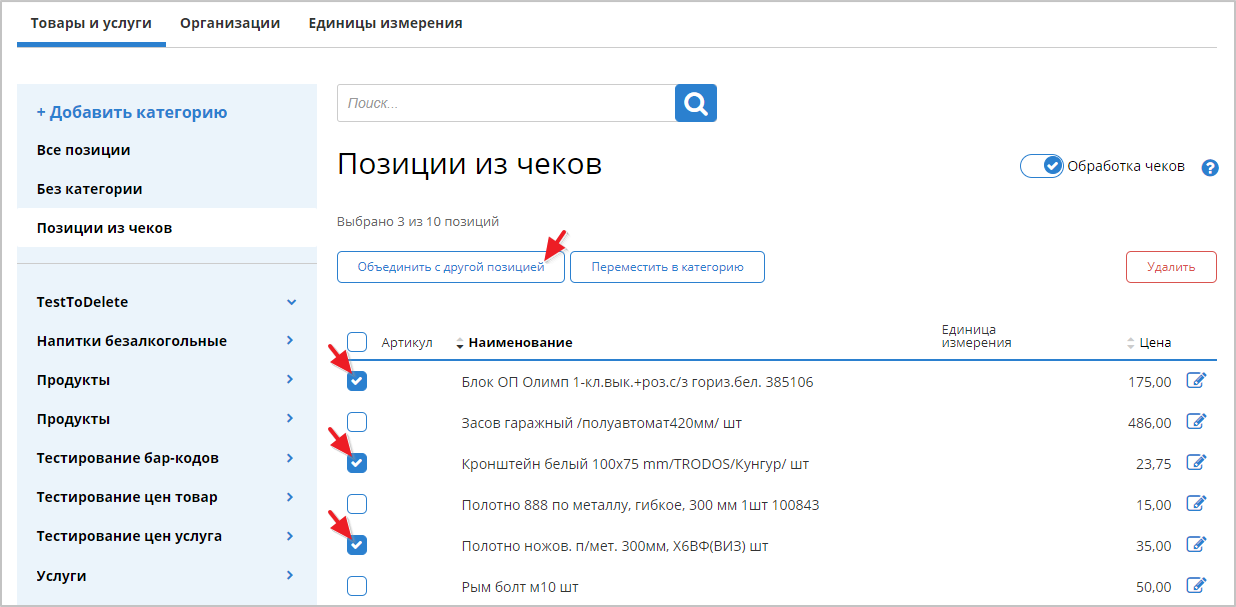 Объединенные позиции пропадут из списка "Позиций из чеков".