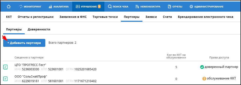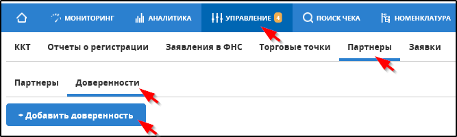 Открыть подраздел "УПРАВЛЕНИЕ" - "Партнеры" - "Доверенности".