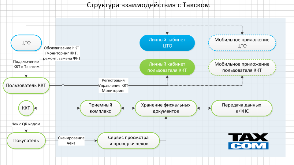 Пользователь ККТ приобретает ККТ и ФН, заходит на сайт "Такском-Касса" и регистрирует личный кабинет в системе "Такском-Касса" (об этом см. п. 4. Доступ к системе). После завершения регистрации пользователь получает номер и дату договора с ОФД для подачи заявления на регистрацию ККТ в ФНС.