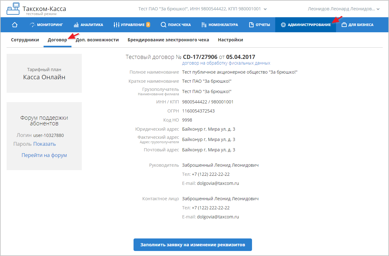 ОФД передает сведения о заключенном с пользователем договоре в ФНС. С краткой информацией о договоре пользователь может ознакомиться в разделе "АДМИНИСТРИРОВАНИЕ" - "Договор". Пример информации о договоре: