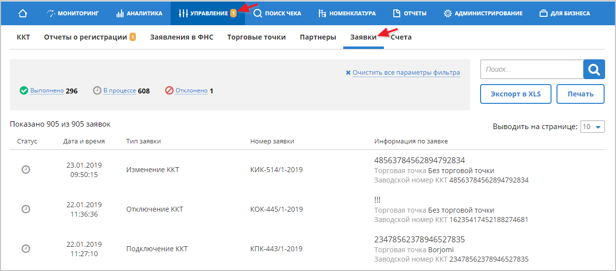 Информация об обработке заявок (на регистрацию в системе, на подключение/отключение ККТ, изменение информации о ККТ) находится разделе "УПРАВЛЕНИЕ" - "Заявки". Пример содержания раздела: