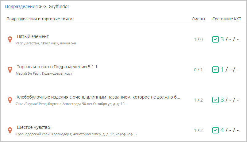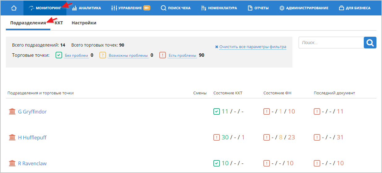 В разделе "МОНИТОРИНГ" - "Подразделения" щелчком мыши на наименовании торговой точки можно перейти к списку ККТ этой торговой точки, а щелчком на наименовании подразделения - перейти к списку ККТ этого подразделения.