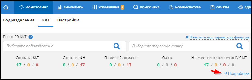 Для установки параметров фильтрации данных ККТ следует нажать ссылку "Подробнее". Пример: