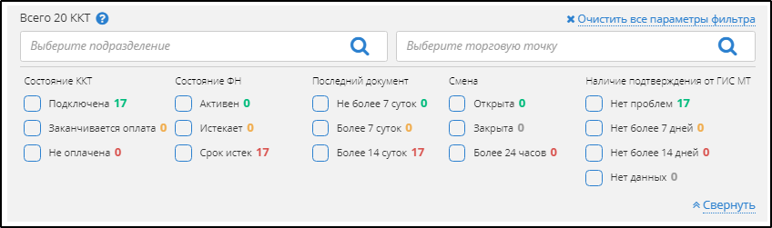 В результате откроется панель, в которой можно галочками отметить, по каким признакам требуется отфильтровать ККТ. Пример: