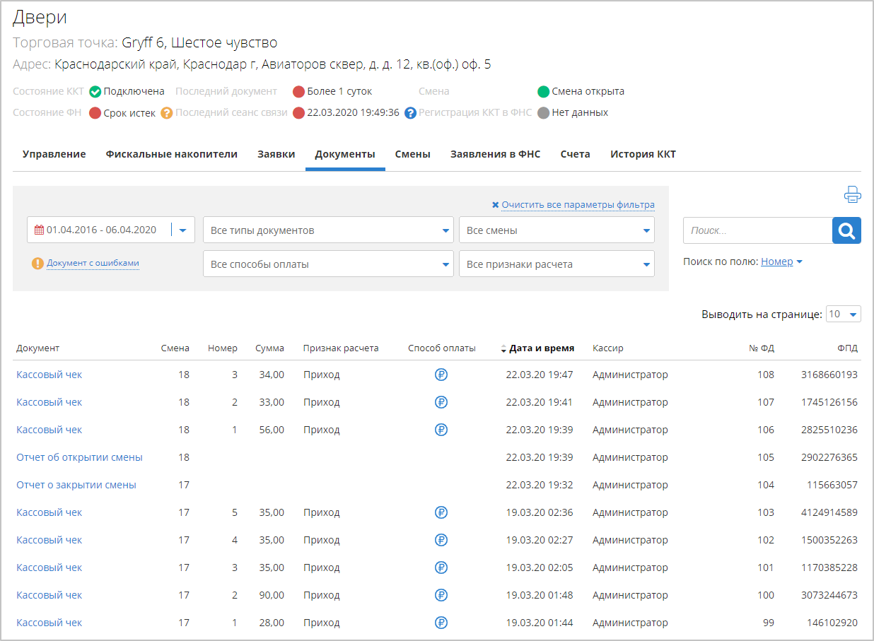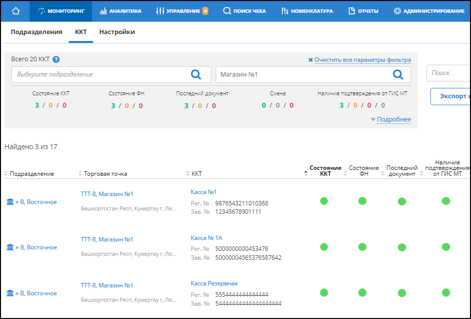 Консолидированная информация по работе ККТ в подразделениях организации и на торговых точках отображается в разделе "Мониторинг" для администратора и сотрудников, имеющих права доступа к информации по данной ККТ.