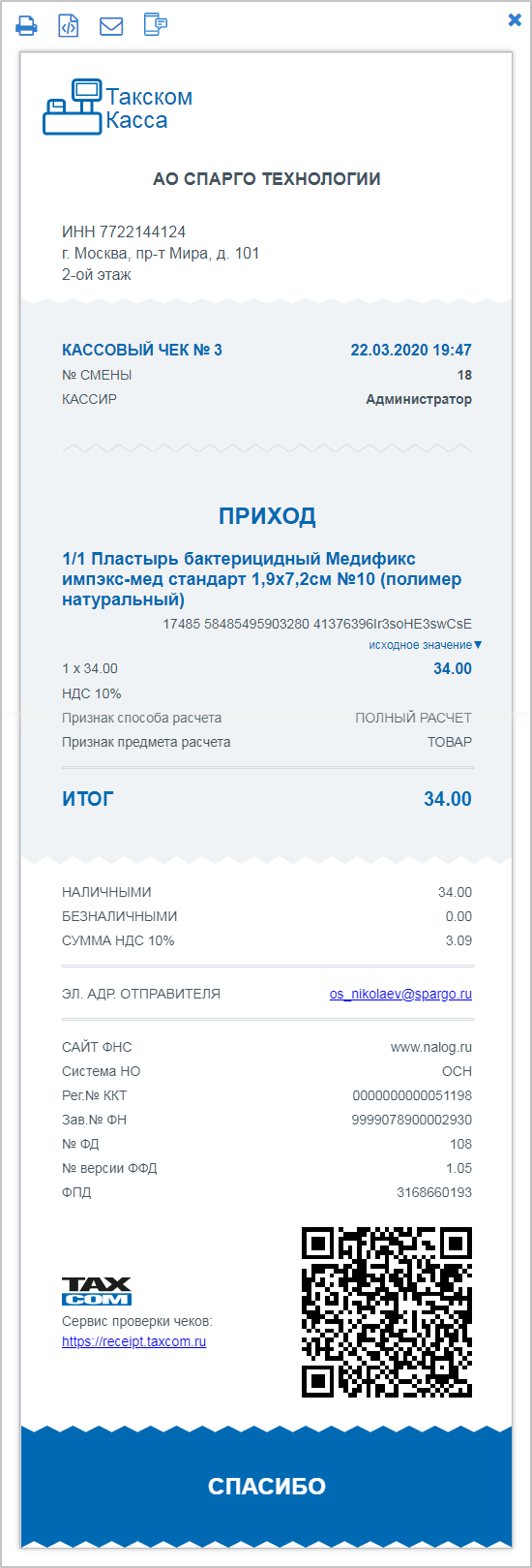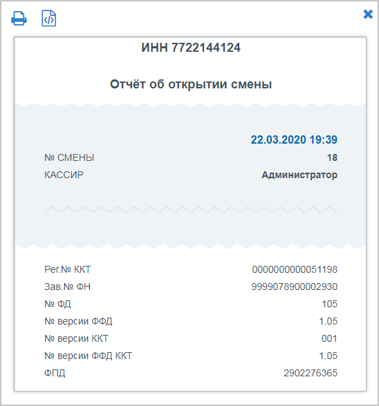 Для просмотра фискального документа необходимо на закладке "Документы" в колонке "Документ" нажать на ссылку с названием документа. Откроется окно документа с кнопками в верхней части: