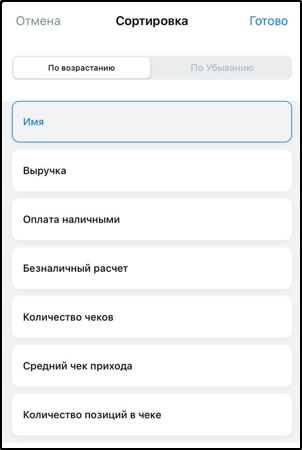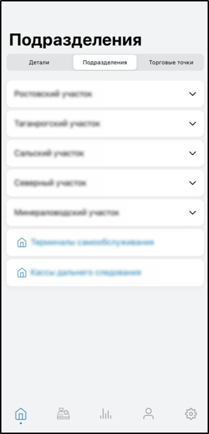 После входа мобильное приложение отображает список подразделений или торговых точек: