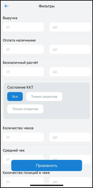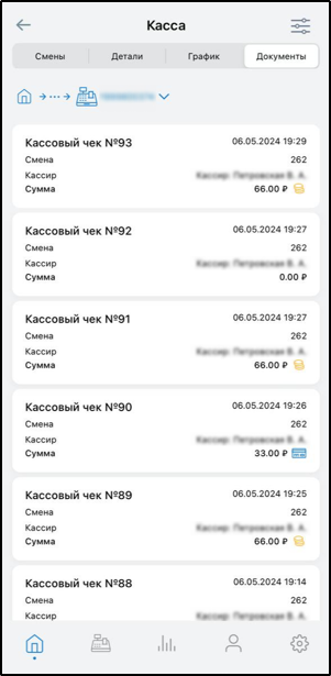 Для получения подробной информации по элементу списка (конкретной торговой точке, кассе, смене или чеку) в мобильном приложении "Такском Касса" следует нажать на блок этого элемента.