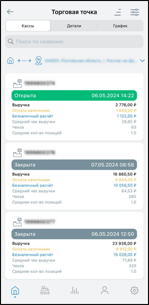 Пример отображения списка касс торговой точки и информации по отдельной кассе: