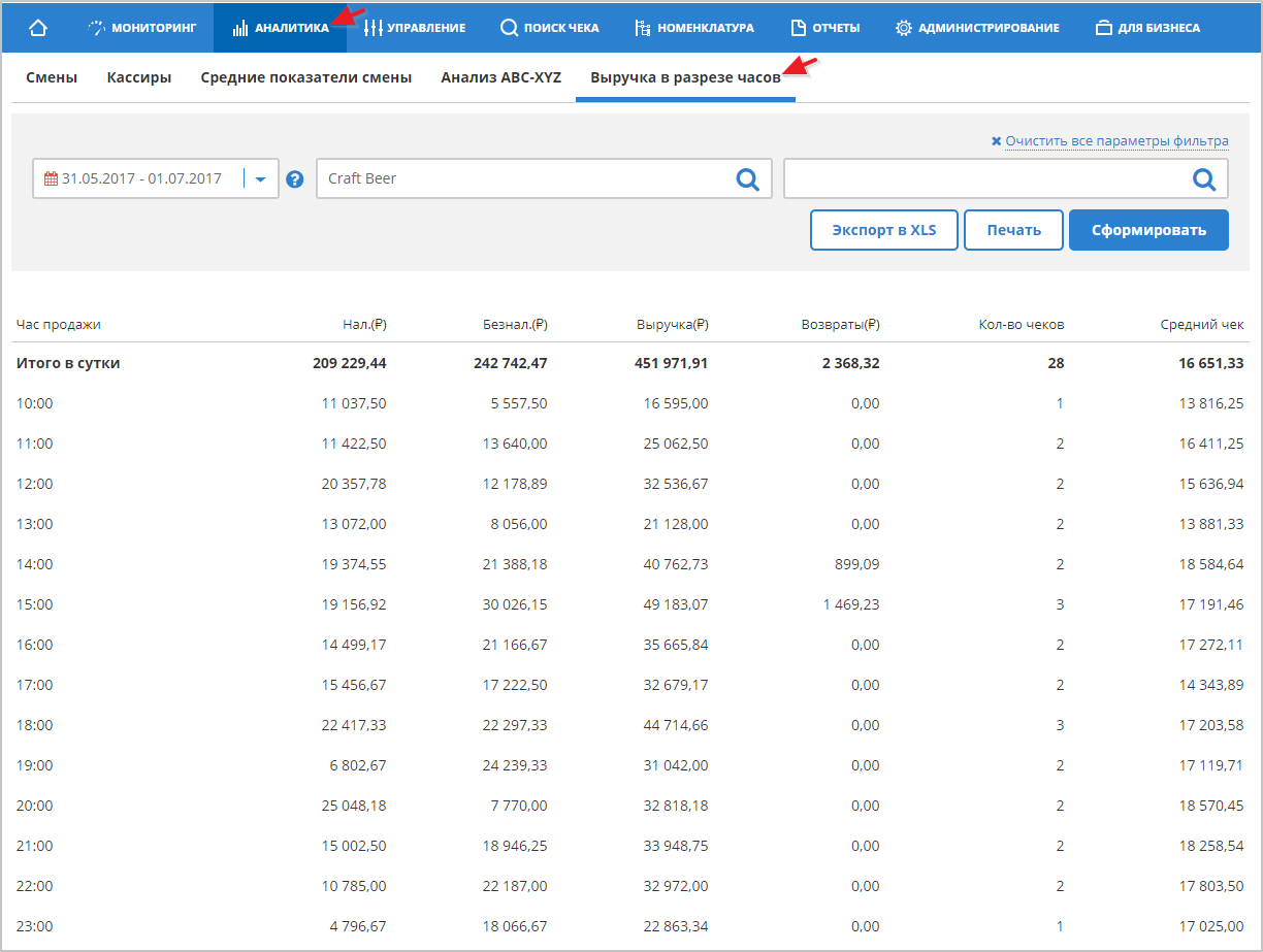 Информация о среднесуточной выручке в разрезе часов доступна в разделе "АНАЛИТИКА" - "Выручка в разрезе часов".