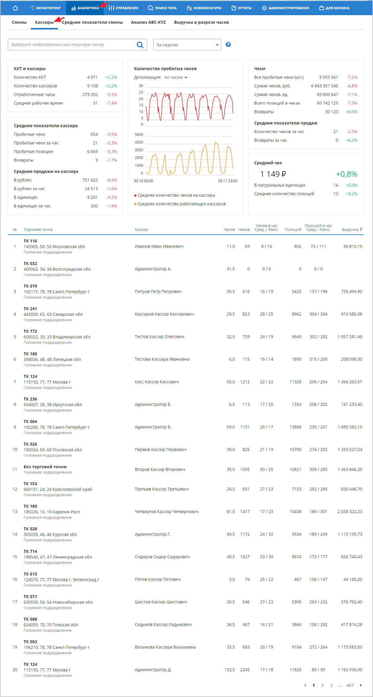 Информация о средних показателях результатов работы кассиров и средних показателях по чеку доступна в разделе "АНАЛИТИКА" - "Кассиры".